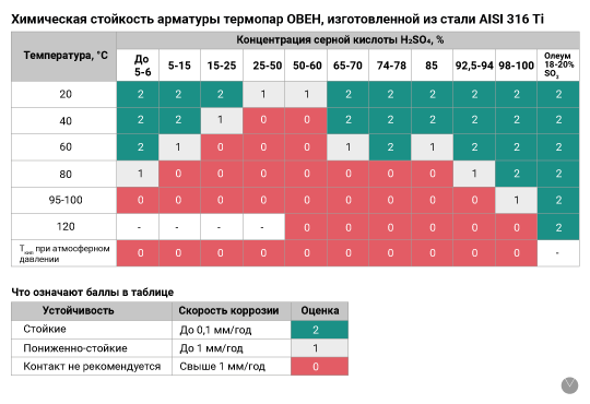Мы упомянули о применении термопар ОВЕН в измерении температур сточных вод. Например, датчики ДТПК075-091Т используются на очистных сооружениях для контроля температуры стоков фармацевтического производства. Эти стоки содержат органические химикаты и сульфаты металлов, и для их обезвреживания с помощью реагентов необходимо поддерживать оптимальный тепловой режим. Датчики ДТПК075 уже более года успешно функционируют в таких сложных условиях. Термопары, помещенные в чехлы из стали AISI 316Ti, устойчивы к различным кислотам, таким как фосфорная, муравьиная, уксусная и серная. Следует отметить стойкость к серной кислоте, поскольку при определенных температурах и концентрациях H2SO4 может разъесть даже эту коррозионностойкую сталь. В таблице представлена зависимость устойчивости стали AISI 316Ti от концентрации и температуры серной кислоты.