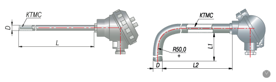 Для описанных выше применений мы предлагаем использовать термопары ДТПХ в арматуре из коррозионностойкой стали AISI 316Ti.Такие датчики температуры изготавливаются на основе КТМС – внутри стального чехла диаметром 10 или 20 мм находится жесткий термопарный кабель в металлической оболочке. Внешняя арматура контактирует с агрессивной средой, защищая термопарный кабель от ее разрушающего воздействия. Диапазон измерения температур – в зависимости от характеристики термопары: от -40 до +600…900 ⁰С.