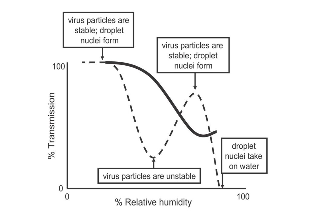 И вот что выяснилось в результате этого эксперимента. При относительной влажности 20-35% была наиболее высокая заражаемость, тогда как при относительной влажности 80% заражаемость блокировалась полностью. Исследование показало, что при обычной «офисной» температуре в 20°C относительная влажность играет важнейшую роль в эффективности распространения вирусов.