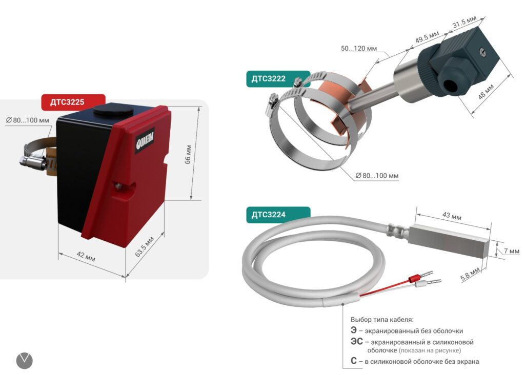 Сравнительные характеристики обновленной и снимаемой с производства линеек ДТС3хххМодель Новая модель Снята с производства ДТС3222 ДТС3224 ДТС3225 НСХ 50М, 100М РТ100, РТ1000 NTC 3k, NTC 10k, NTC 20k 50М РТ100, РТ1000 Материал контактирующей с трубопроводом поверхности Контактная пластина – медь Корпус датчика — латунь Контактная пластина – медь IP 65 54, 67* 54 Аксессуары в комплекте Хомут червячный 2 шт. — Хомут червячный 1 шт. Подключение линии связи DIN-разъем Кабельный вывод от 0,2 м до 20 м Винтовые клеммы в коммутационной головке Сертификация Отказное письмо Сертификат об утверждении типа СИ в III квартале 2024 Отказное письмо Особенности монтажа Благодаря штоку (от 50 до 120 мм) удобно укрывать арматуру теплоизоляционным материалом Компактный корпус позволяет разместить датчик под теплоизоляцией трубопровода —