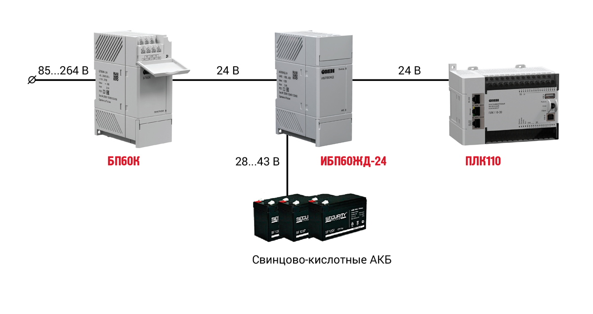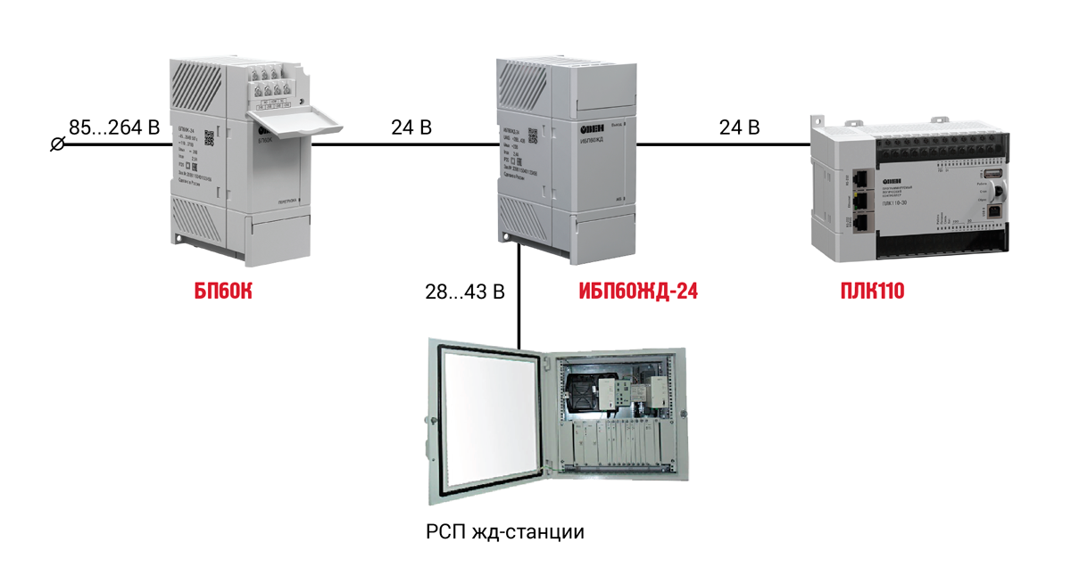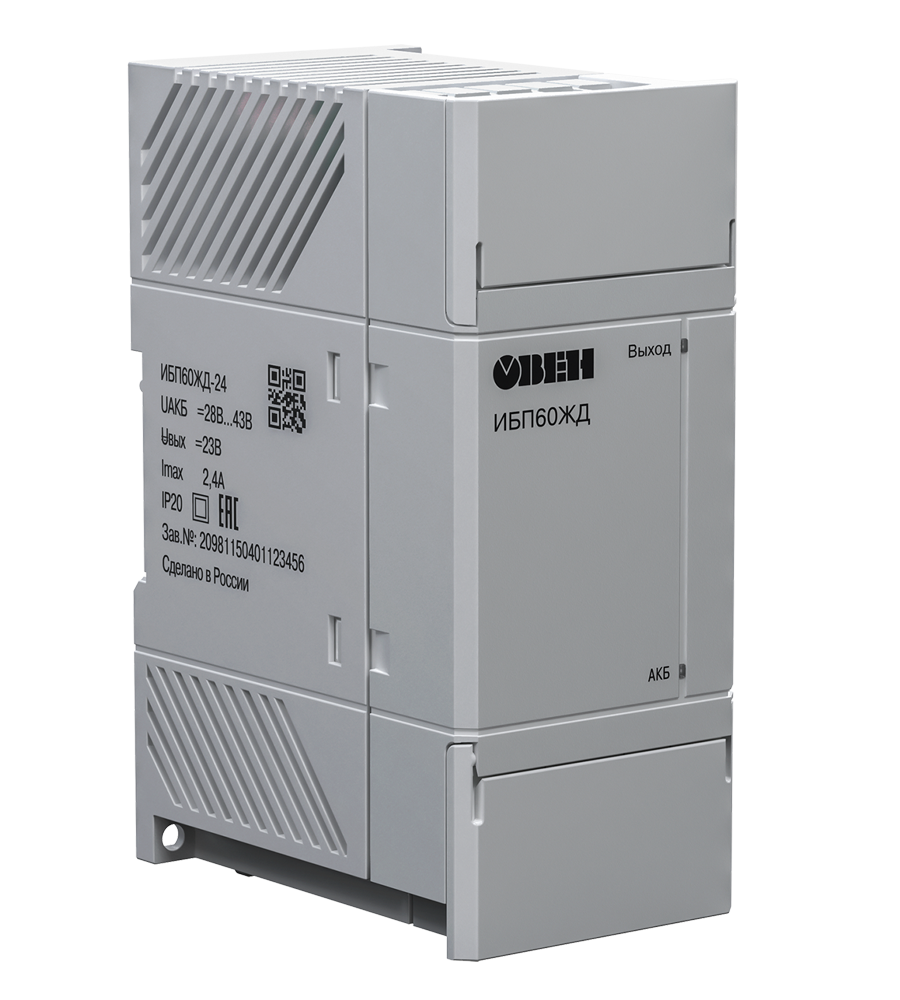 ОВЕН ИБП60ЖД-24 предназначен для использования в качестве резервированного источника вторичного питания при работе от источника постоянного тока ОВЕН БП60К 24 В или от резервной сети питания постоянного тока ЖД станций (28…43 В).