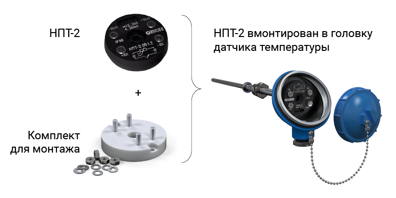В то же время для преобразования сигнала сенсора в унифицированный сигнал 4…20 мА часто используется нормирующий преобразователь НПТ-2 (исполнение «таблетка»). При этом его необходимо смонтировать внутрь головки датчика. Для этого и служит «Комплект для монтажа НПТ-2 в МГ»