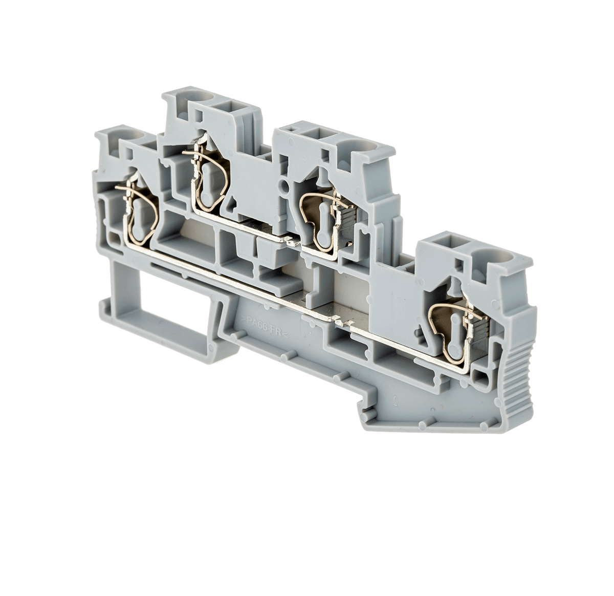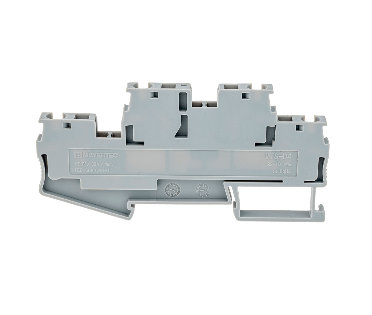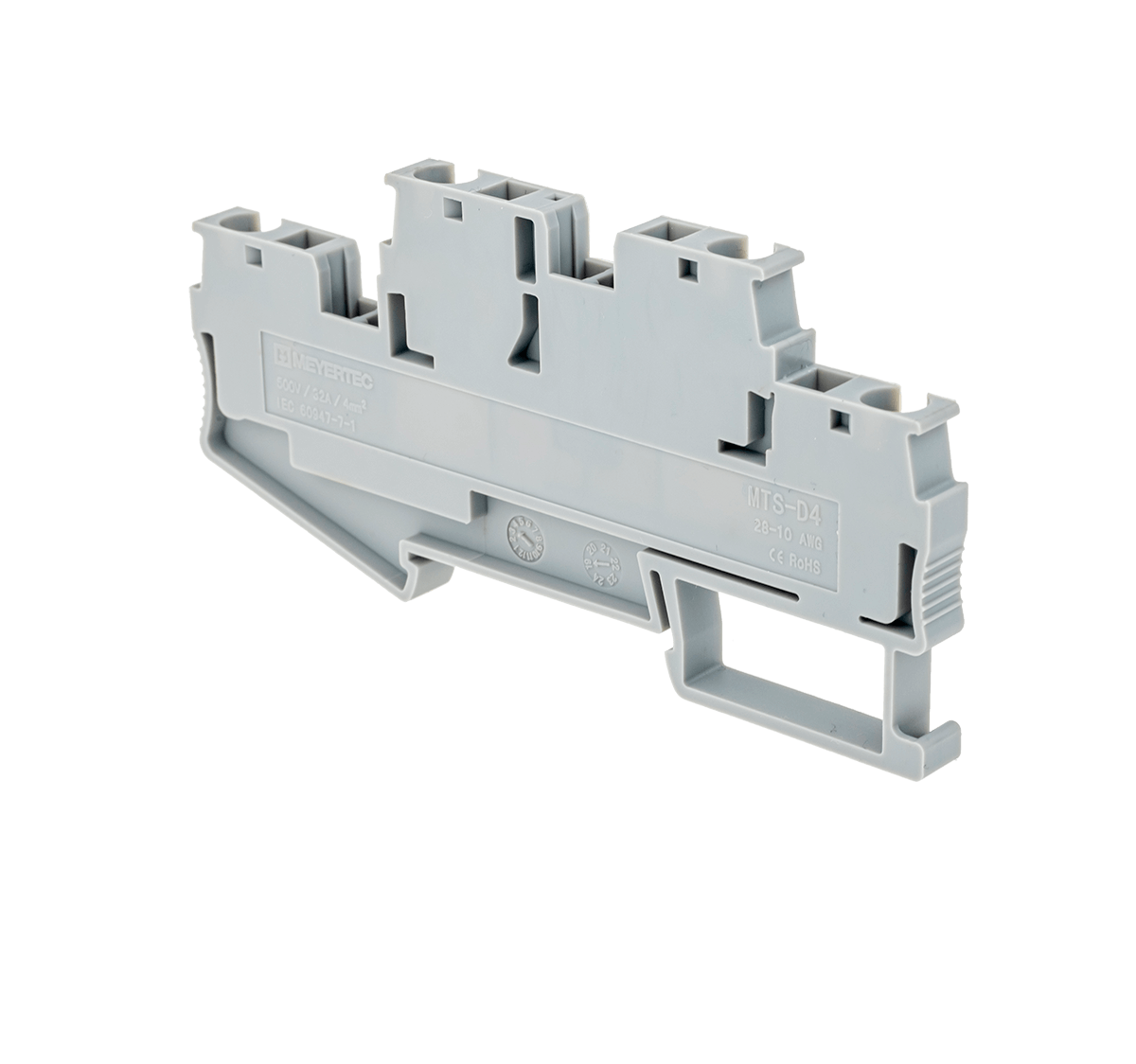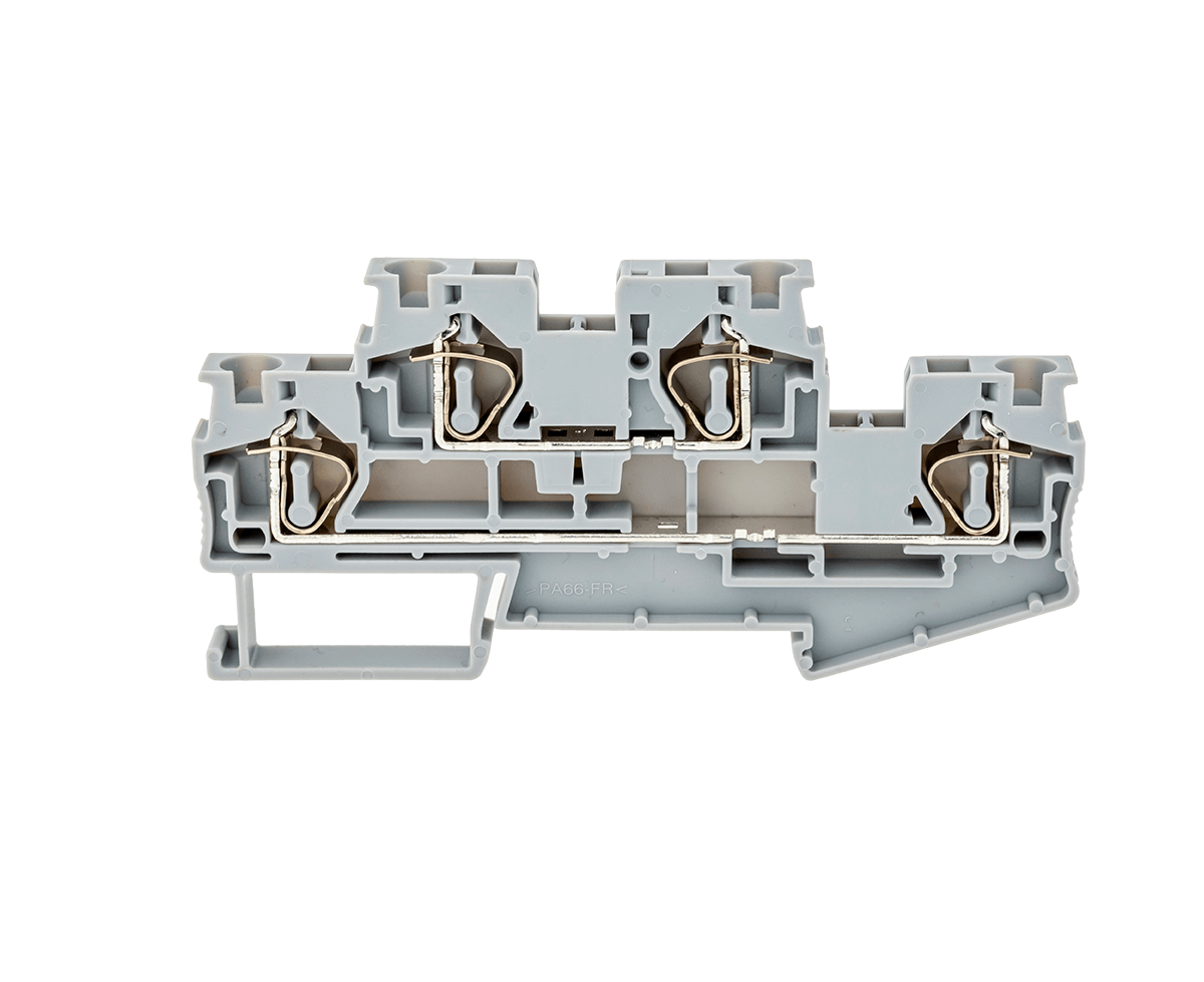 Двухуровневые пружинные клеммы MTS-D4 применяются в шкафах автоматики с высокой плотностью монтажа для экономии места на DIN-рейке. Оба уровня имеют монтажное отверстие для установки перемычек.