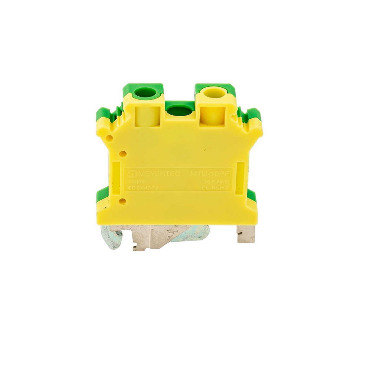 Заземляющие клеммы MTU-10PE обеспечивают заземление проводников благодаря контакту токоведущей шины с DIN-рейкой (при условии заземления монтажной пластины шкафа). Конструкция клемм не требует применения торцевых заглушек. Заземляющие клеммы надежно устанавливаются на DIN-рейке с помощью винта, что позволяет использовать их в качестве торцевых фиксаторов клеммного ряда.