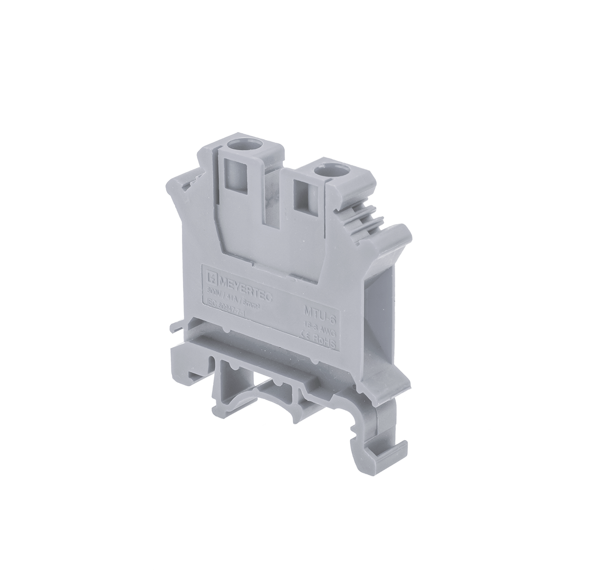 Одноуровневые винтовые клеммы MTU-6 – простой и удобный способ подключения устройств в шкафах автоматики. Клеммы MTU-6 предназначены для проводников сечением 6мм2. Открытую токопроводящую часть клеммного ряда необходимо закрыть торцевой заглушкой. Одноуровневые клеммы имеют одинаковые габаритные размеры для всех сечений, кроме ширины, которая зависит от сечения выбираемого проводника.