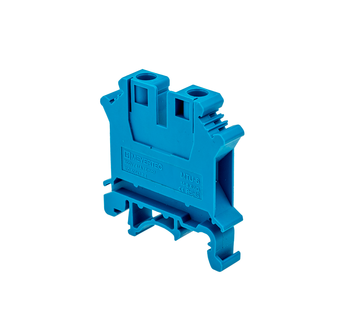 Одноуровневые винтовые клеммы MTU-6BL – простой и удобный способ подключения устройств в шкафах автоматики. Клеммы MTU-6BL предназначены для проводников сечением 6мм2. Открытую токопроводящую часть клеммного ряда необходимо закрыть торцевой заглушкой. Одноуровневые клеммы имеют одинаковые габаритные размеры для всех сечений, кроме ширины, которая зависит от сечения выбираемого проводника.