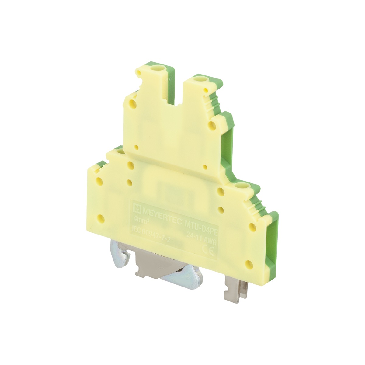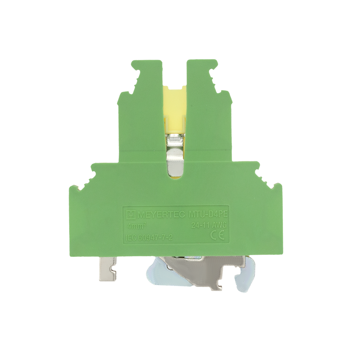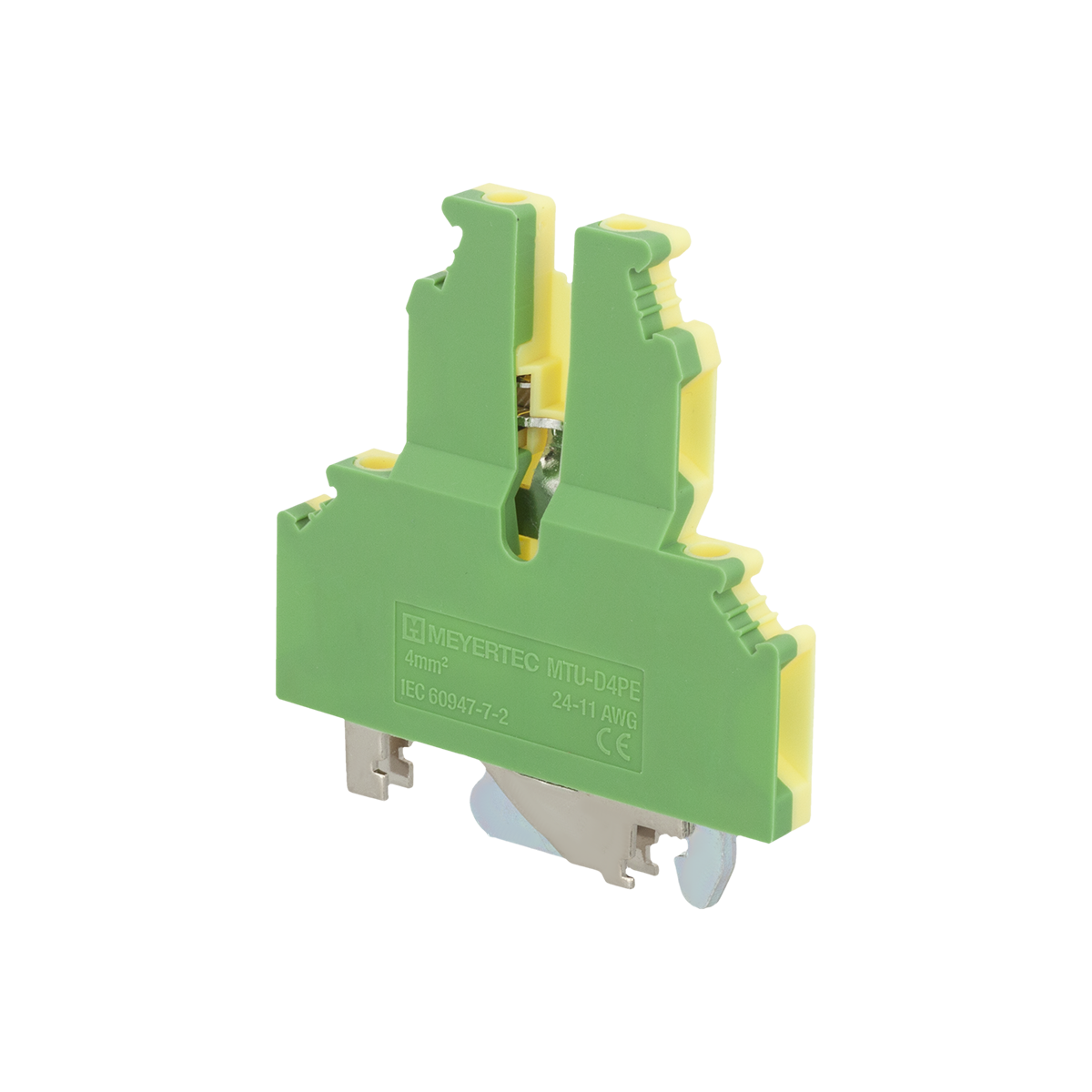 Заземляющие двухуровневые клеммы MTU-D4PE обеспечивают заземление проводников благодаря контакту токоведущей шины с DIN-рейкой (при условии заземления монтажной пластины шкафа). Конструкция клемм не требует применения торцевых заглушек. Заземляющие клеммы надежно устанавливаются на DIN-рейке с помощью винтового механизма.
