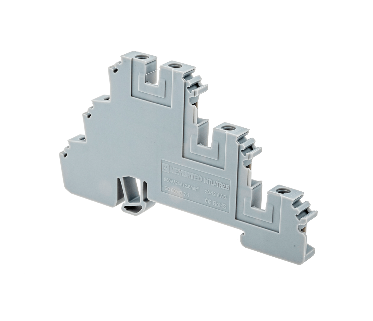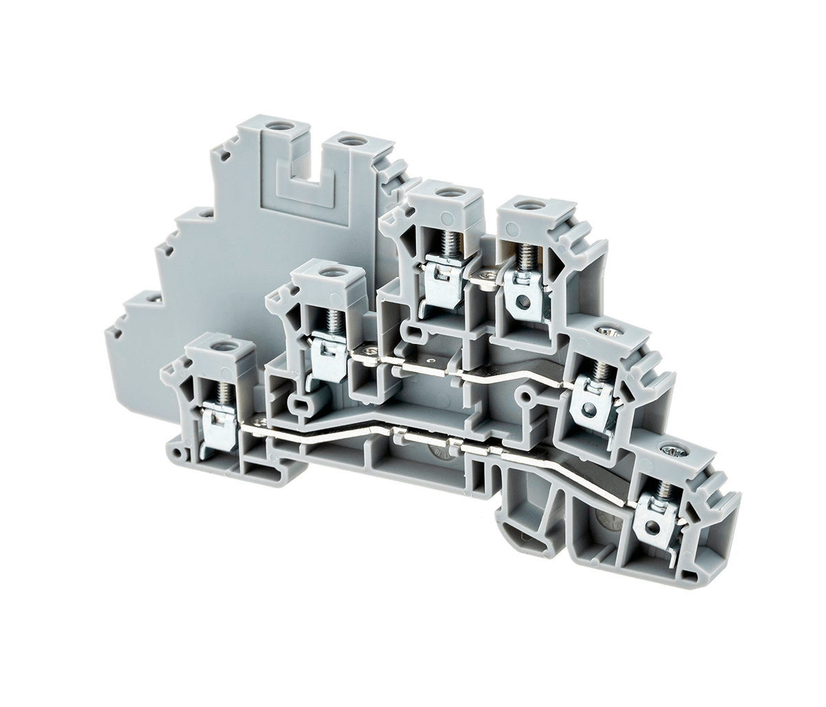 Трехуровневые винтовые клеммы MTU-TR2.5 применяются в шкафах автоматики с высокой плотностью монтажа при ограниченном пространстве. Клеммы применяются для подключения трехпроводных датчиков и других исполнительных механизмов. Сигнал заводится на верхний уровень, питание разводится по нижним уровням при помощи перемычек.