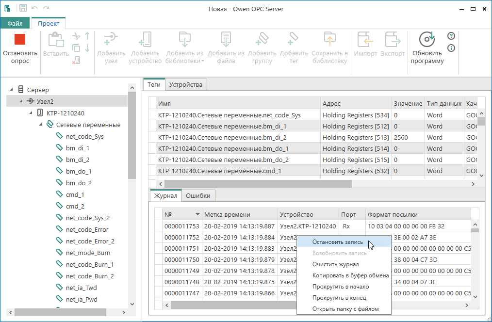 - Создание и сохранение пользовательских шаблонов для приборов, работающих по протоколам Modbus TCP, Modbus RTU/ASCII, ОВЕН.