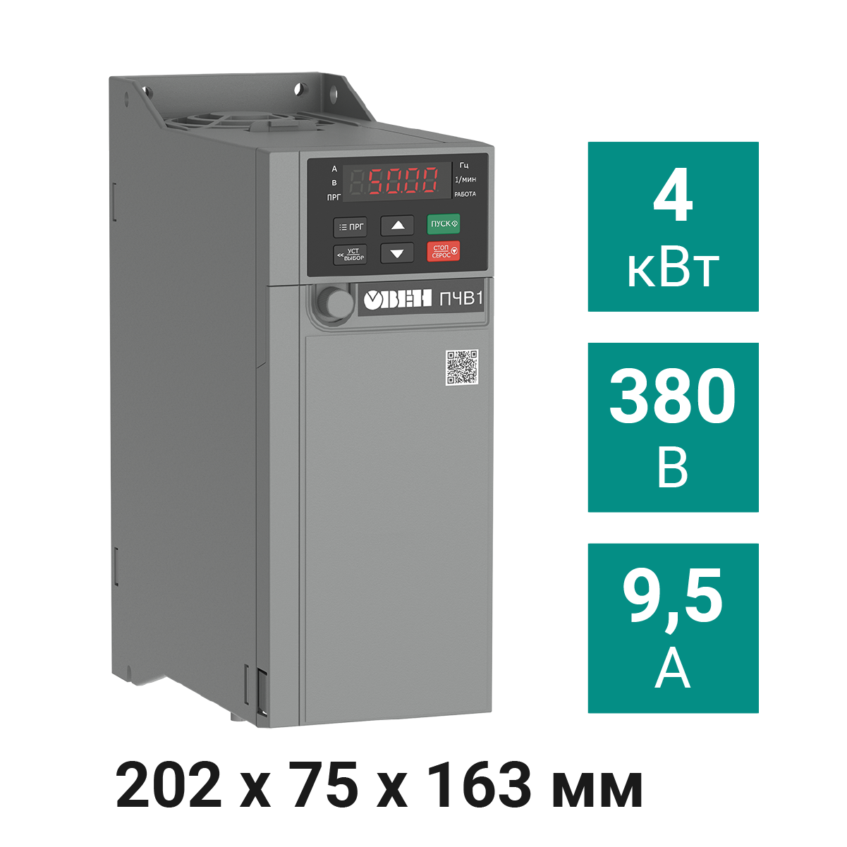 Преобразователь частоты ПЧВ1-4К0-В [М01] предназначен для управления электродвигателями мощностью 4,0 кВт. Номинальный выходной ток – 9,5 А, использует трехфазный источник питания переменного напряжения 380 В.