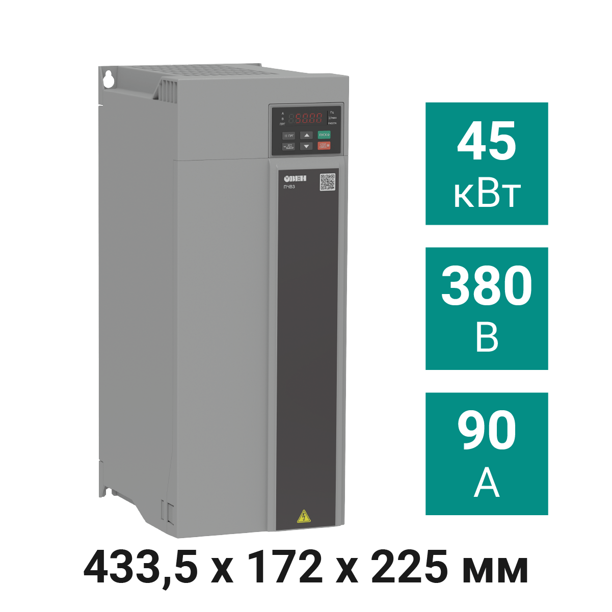 Преобразователь частоты ПЧВ3-45К-В [М01] предназначен для управления электродвигателями мощностью 45,0 кВт. Номинальный выходной ток – 90,0 А, использует трехфазный источник питания переменного напряжения 380 В.
