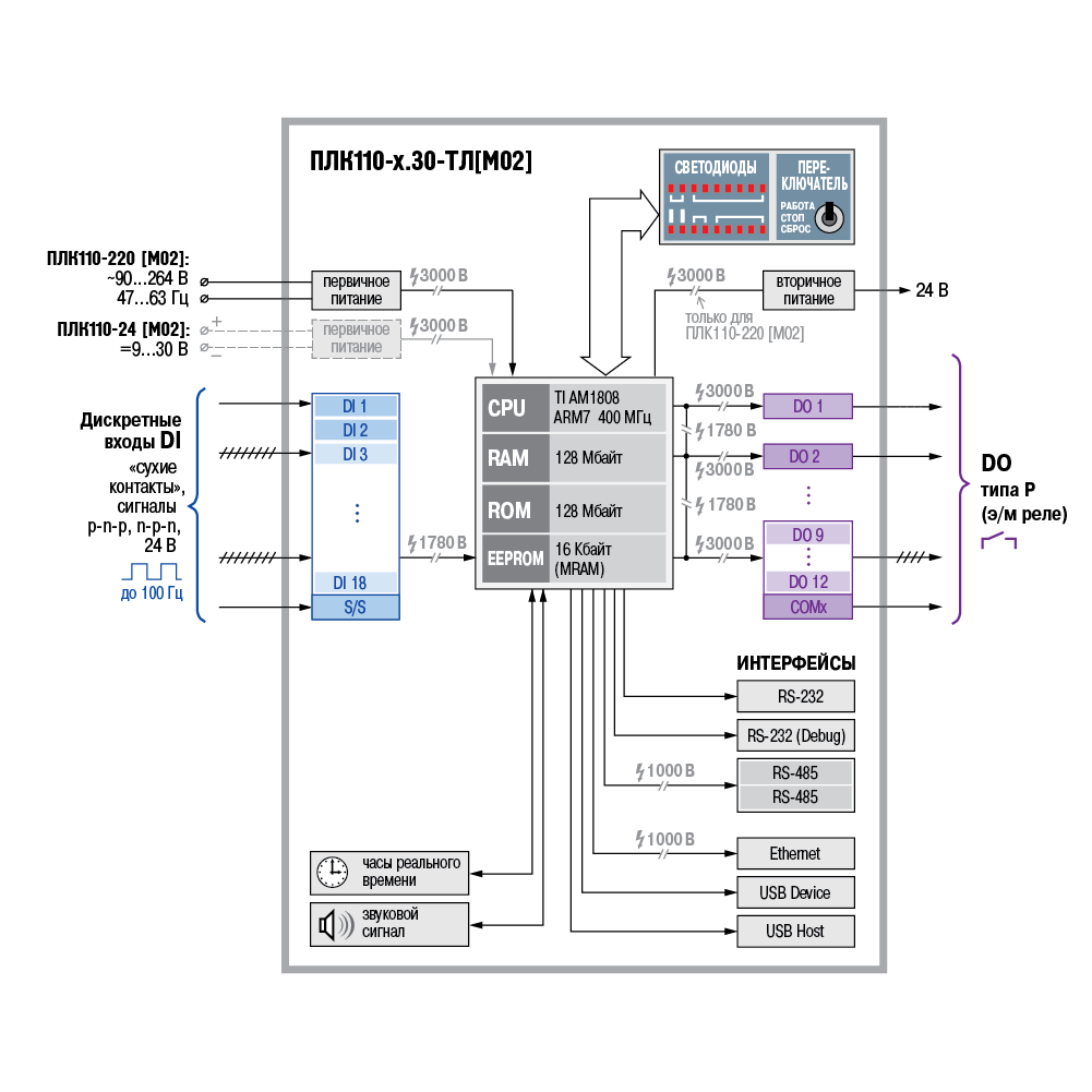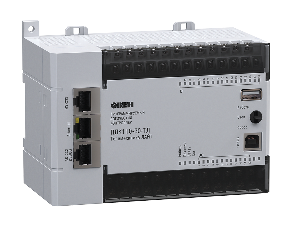 ОВЕН ПЛК110-30-ТЛ [М02] – программируемый моноблочный контроллер с дискретными входами/выходами на борту для автоматизации средних систем с возможностью программирования из SCADA-системы ОВЕН Телемеханика ЛАЙТ.