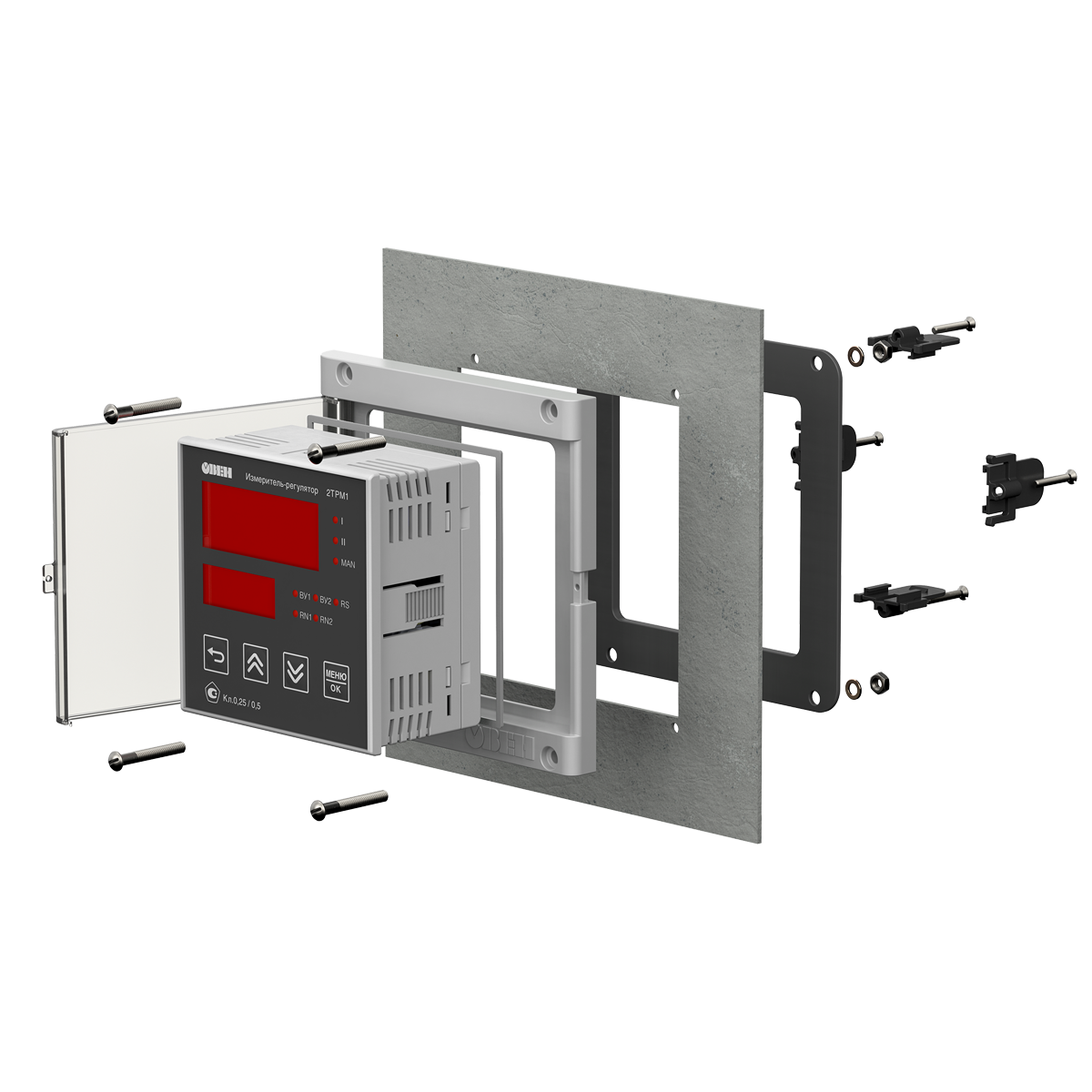 Рамка вместе с прибором крепится к щиту с помощью штатных щитовых кронштейнов. Для жестких условий вибрации может быть предусмотрено крепление через щит на винтах.