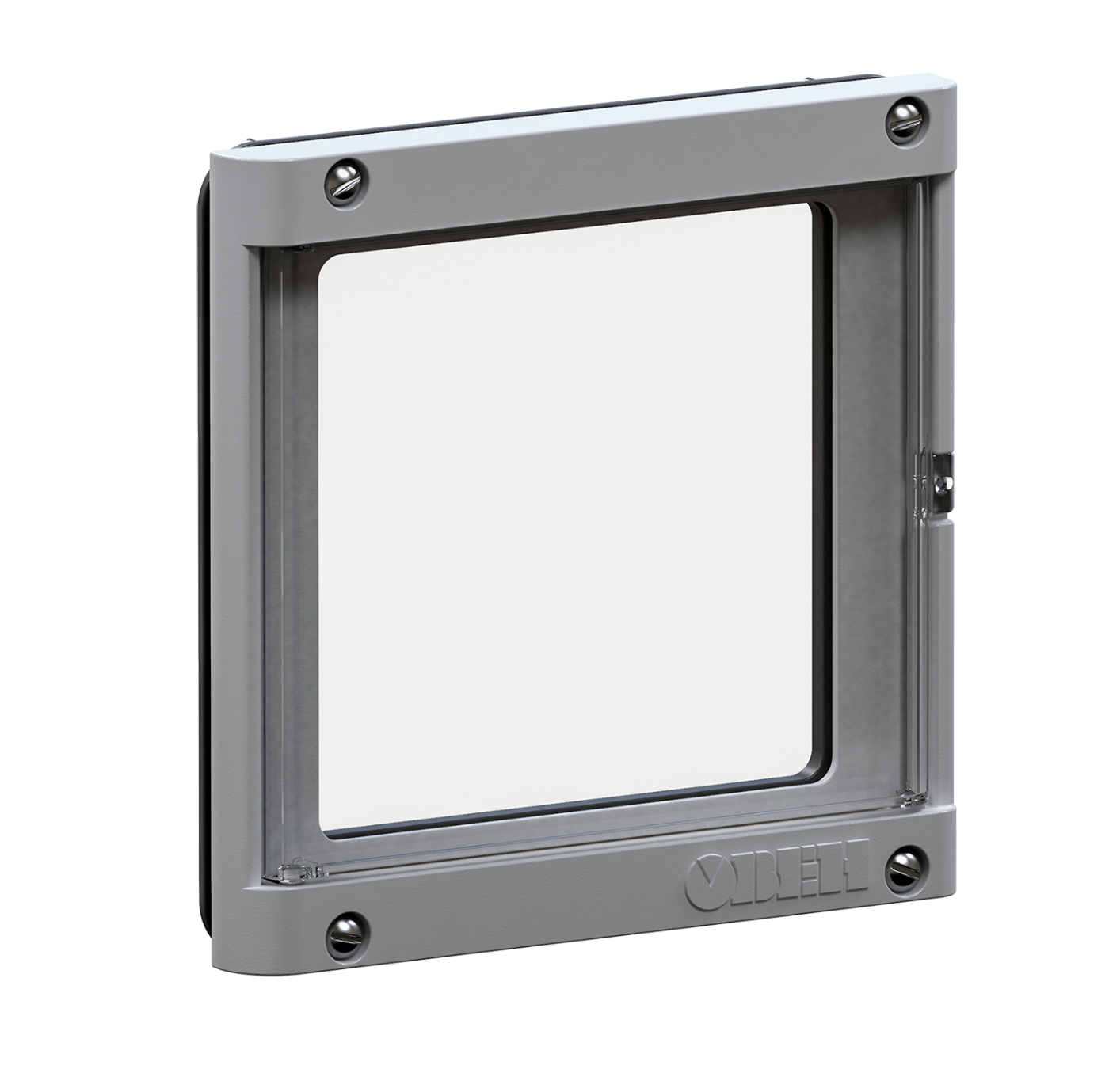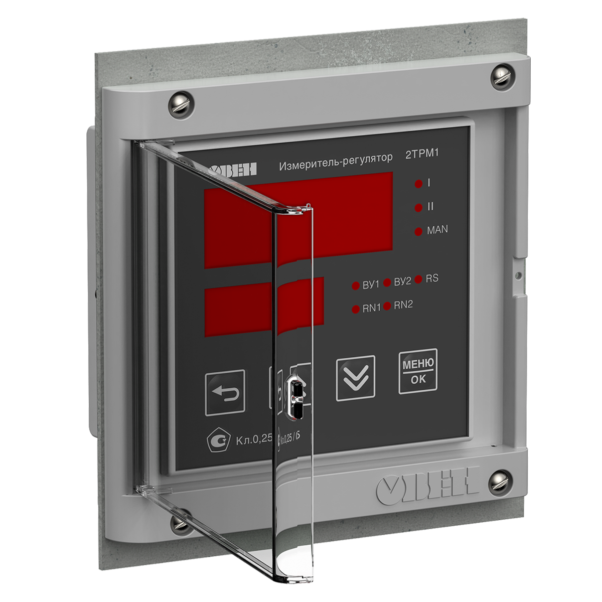 Конструкция рамки содержит прозрачную дверцу, которая может открываться на угол до 100 градусов и фиксироваться в открытом положении. Прозрачная дверца осуществляет дополнительную защиту приборов от внешних механических воздействий, защищает лицевую панель от попадания брызг, загрязнений, значительно увеличивает срок службы гибко-пленочной клавиатуры прибора.