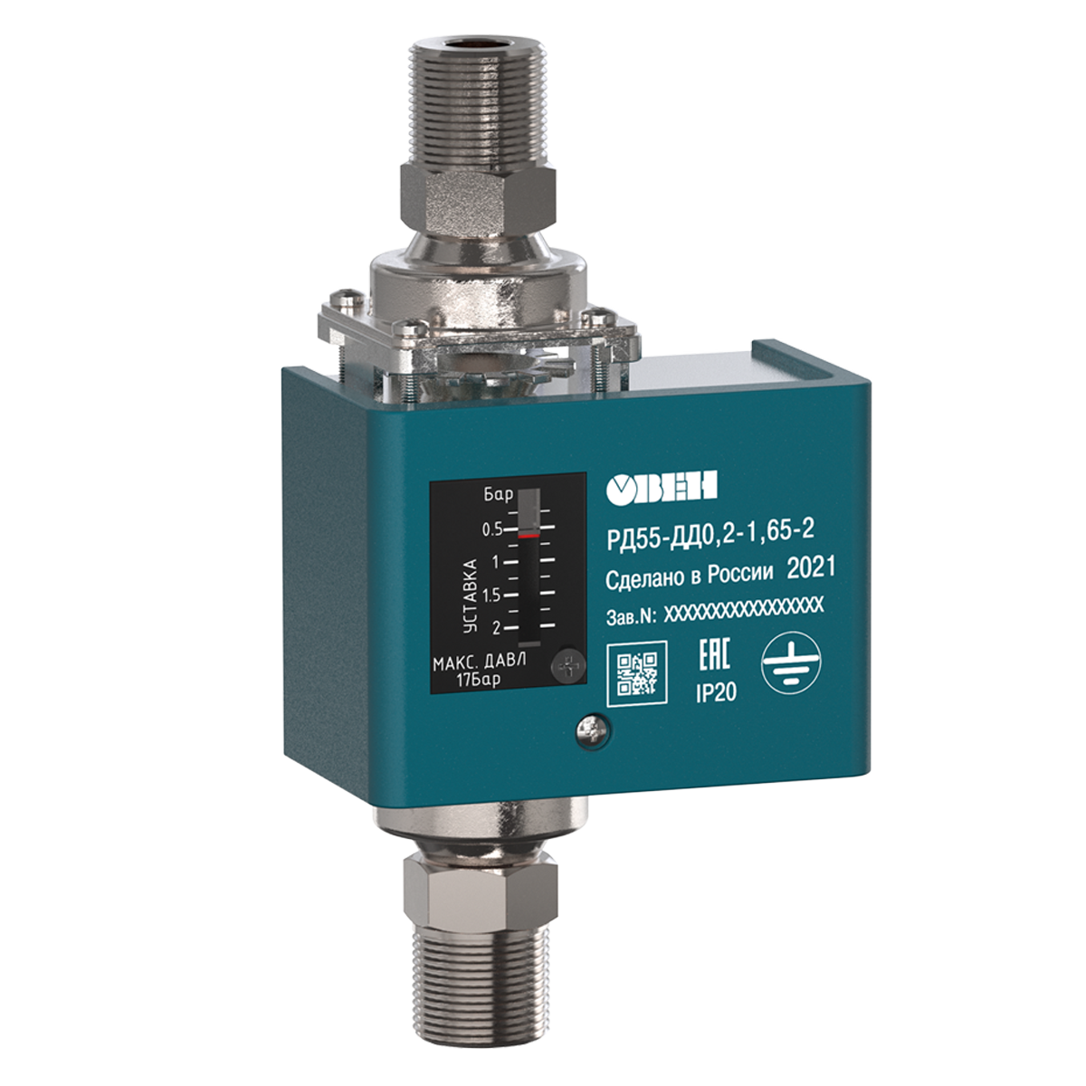 РД55 представляет собой механическое реле перепада давления для коммутации электрических цепей в зависимости от изменения разности двух давлений измеряемой среды. Принцип действия реле состоит в сравнении двух давлений, подаваемых с двух сторон на сильфон, который, деформируясь, переключает однополюсный перекидной контакт. Порог срабатывания реле настраивается пользователем.