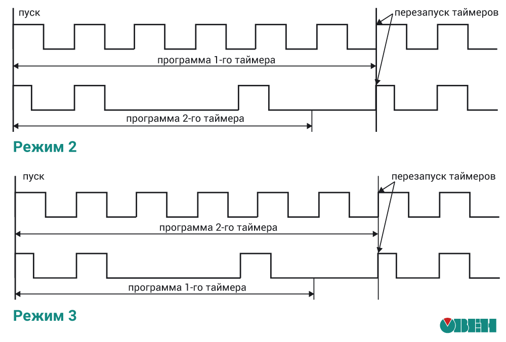 В данных режимах перезапуск обоих таймеров произойдет по окончанию работы либо первого (режим 2), либо второго (режим 3).
