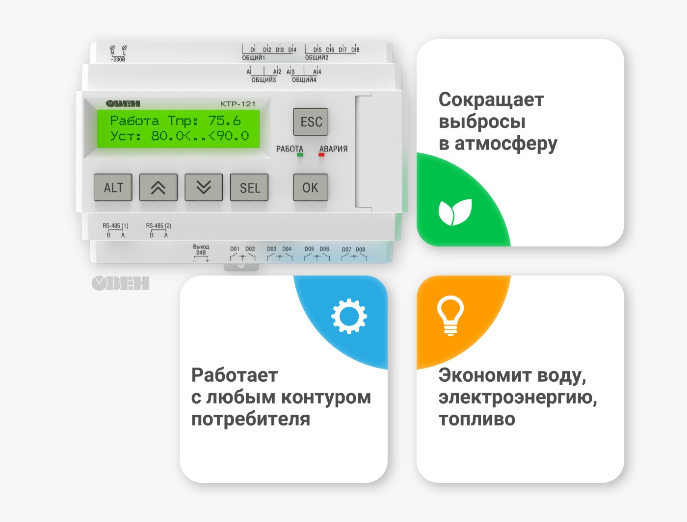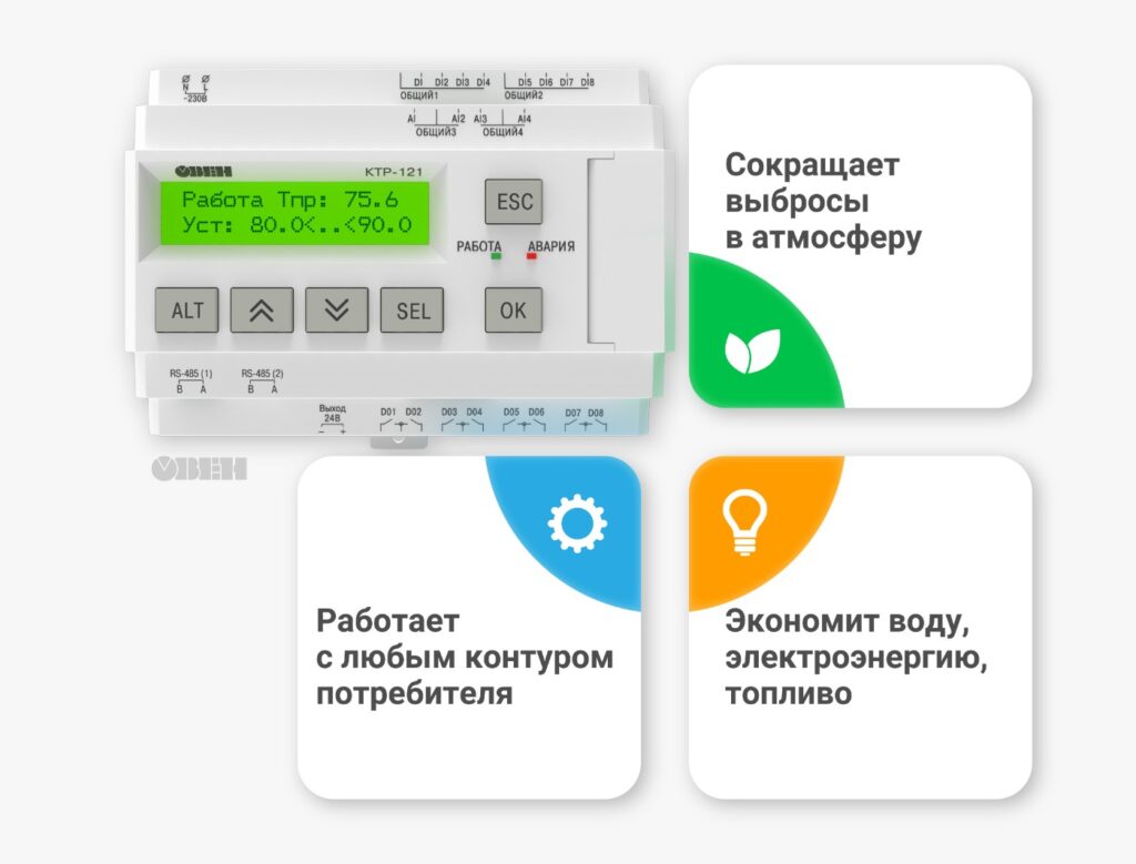 Экономия ресурсов становится неотъемлемой частью современных котельных, и контроллеры КТР-121 позволяют оптимизировать потребление воды, электроэнергии и топлива с помощью различных технологий, таких как плавный пуск, ротация котлов и управление отсечным клапаном.
