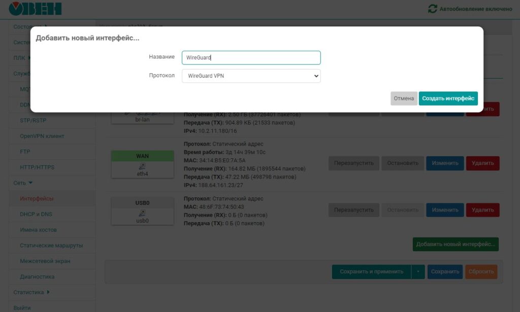 Настройка WireGuard выполняется путем создания виртуального интерфейса: Сеть – Интерфейсы – Добавить новый интерфейс – Протокол: WireGuard VPN.