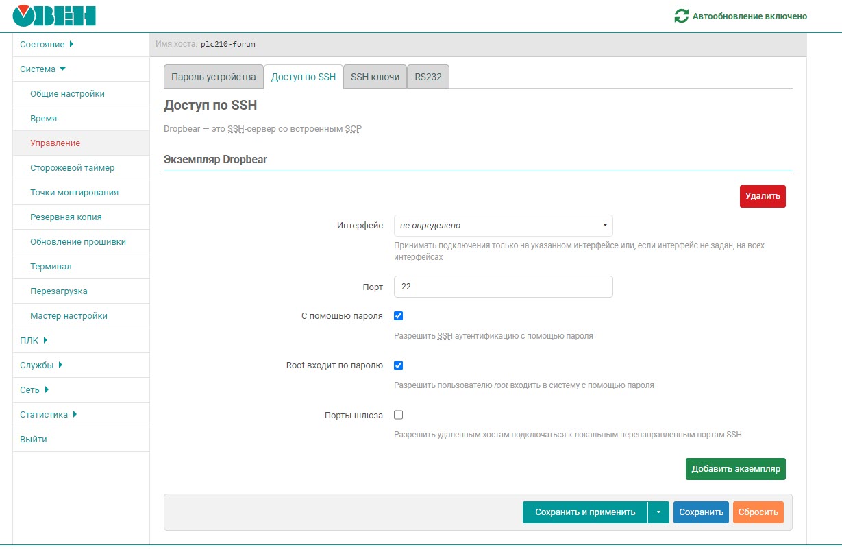 На вкладке «Система — Управление — Доступ по SSH» можно изменить порт SSH-сервера (поскольку стандартные порты обычно проверяются злоумышленниками в первую очередь) и выбрать сетевой интерфейс, через который он будет доступен (например, можно настроить SSH-сервер так, чтобы он был доступен только через интерфейс USB). На вкладке «Система — Управление — Ключи SSH» можно установить ключ, который потребуется на SSH-клиенте для подключения к SSH-серверу контроллера.