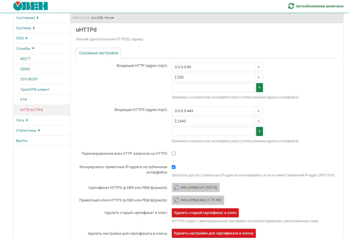 По умолчанию сервер web-конфигуратора обеспечивает подключение как по протоколу HTTP (незащищенный), так и по HTTPS (защищенный). На вкладке «Службы — HTTP/HTTPS» можно изменить порты сервера web-конфигуратора и создать или загрузить сертификаты безопасности для протокола HTTPS.