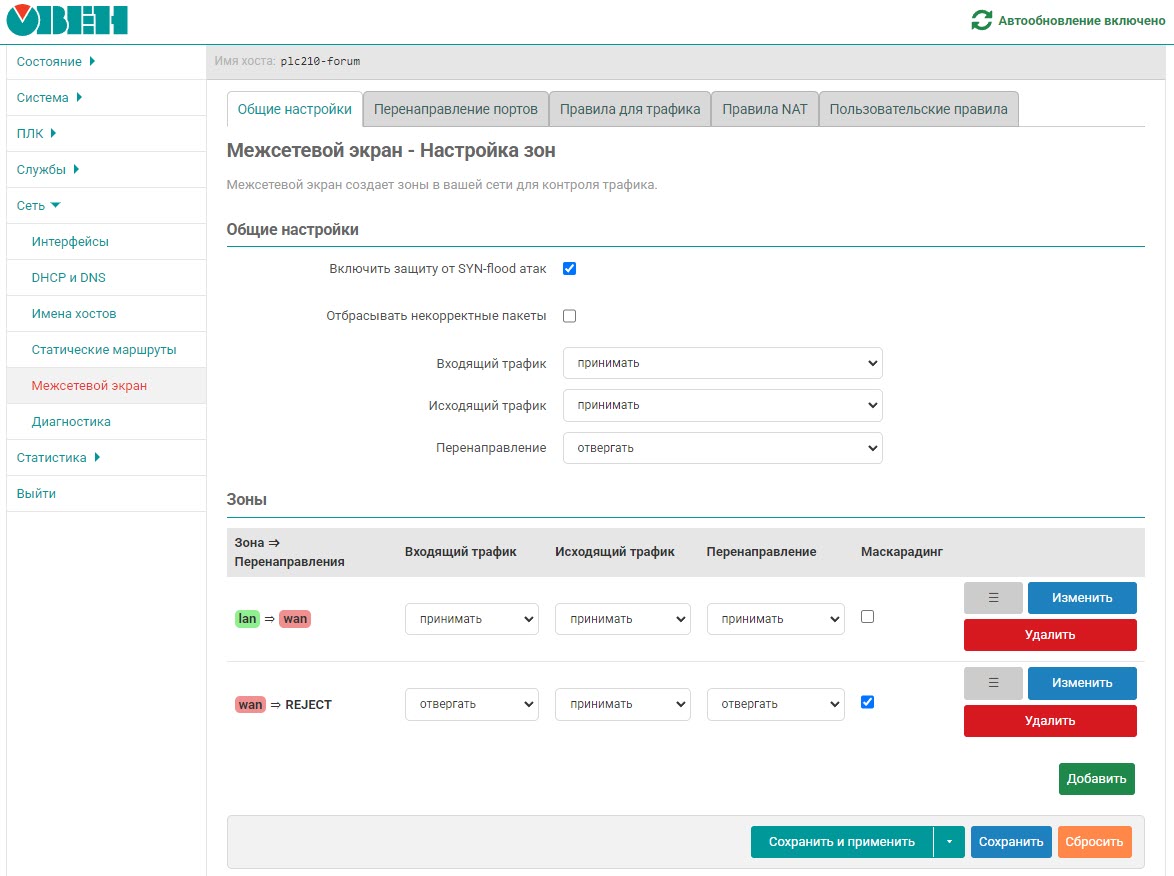 Важной частью OpenWrt является межсетевой экран, который обеспечивает фильтрацию межсетевого трафика. Это критически важно, особенно когда контроллер ПЛК напрямую подключен к Интернету или используется в качестве шлюза между сетью АСУ и корпоративной сетью предприятия.