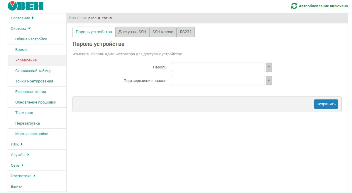 Доступ к web-конфигуратору требует авторизации. По умолчанию используется логин root и пароль owen. Логин не может быть изменен, а пароль задается на вкладке Система – Управление – Пароль устройства. Рекомендуется на этапе настройки установить свой надёжный пароль, чтобы запретить доступ к web-конфигуратору для посторонних.